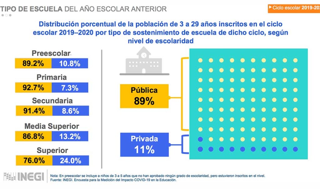 En la encuesta se determinó que 5.2 millones de niños no están tomando clases por pandemia o pobreza, es decir 2.3 millones de niños, adolescentes y jóvenes. Además se detectó que de los 54.3 millones de niños, adolescentes y jóvenes existentes en el país, 62.0% (33.6 millones) estuvo inscrita en el ciclo escolar 2019-2020, mismos que 2.2% (738.4 mil personas) no concluyeron el ciclo escolar 2019-2020 y más de la mitad (58.9%) señalaron directamente que fue por un motivo relacionado a la Covid-19.