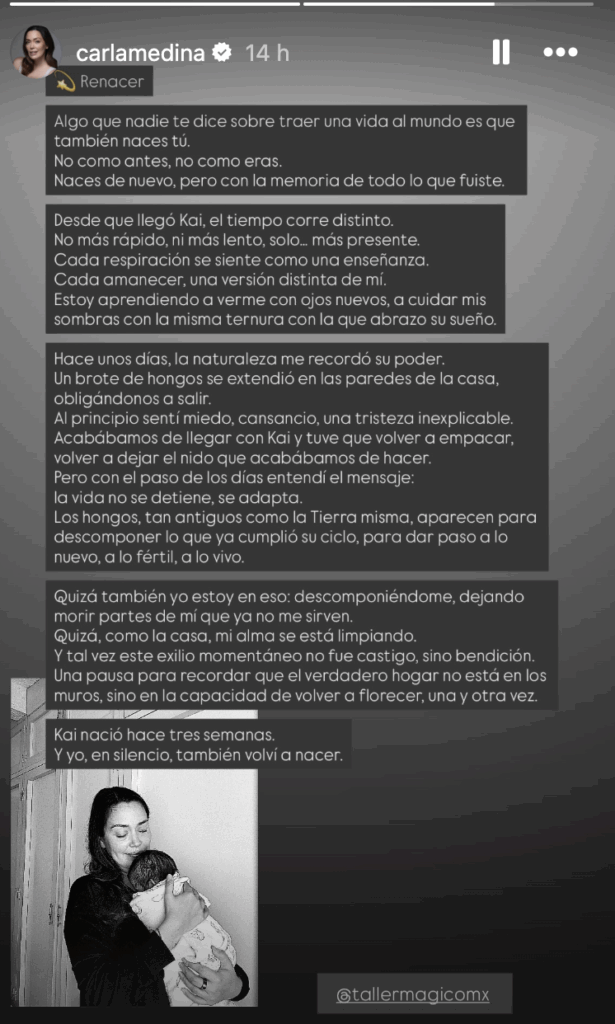 Con este mensaje, Carla Medina muestra una maternidad sin filtros: vulnerable, real y llena de aprendizajes que van más allá de la idealización del posparto.
