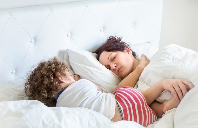 La maternidad se despierta con un pequeño trasero o pie en la cara