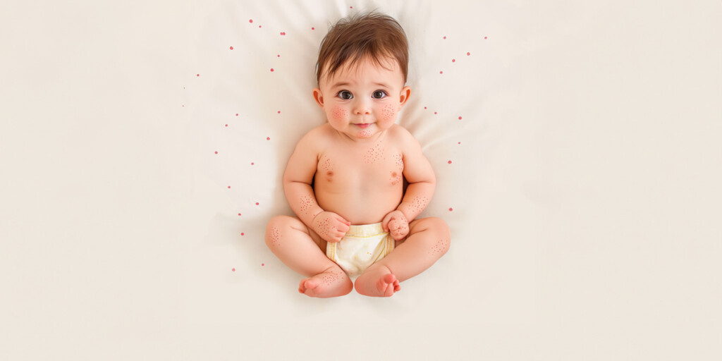 El sarampión causa un sarpullido de manchitas rojas que casi siempre aparecen primero en la cara y luego, detrás de las orejas; después las ronchas salen en el pecho, la espalda y, finalmente, en los pies.