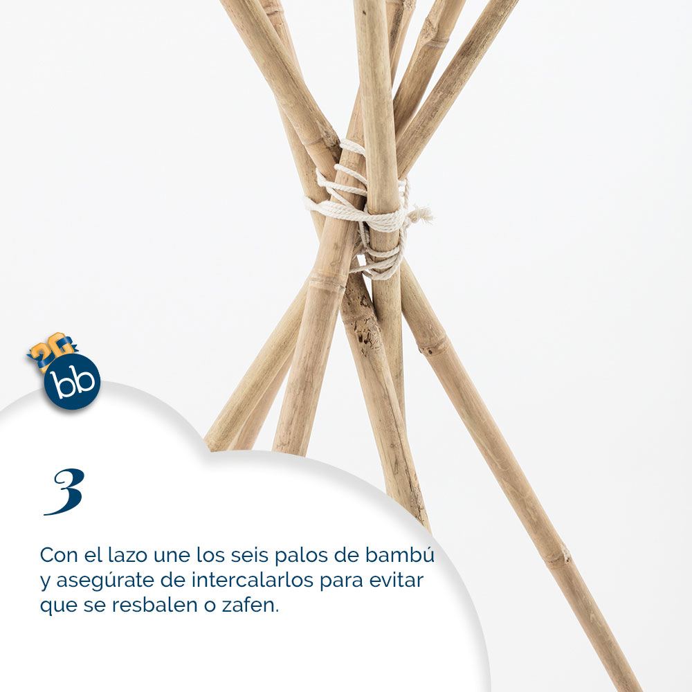 ¿Recuerdas las tiras que cortaste en un principio? Es momento de usarlas, cóselas por dentro de la tienda en las esquinas e inserta los palos de bambú en los hoyos.